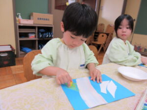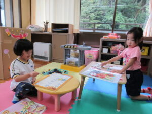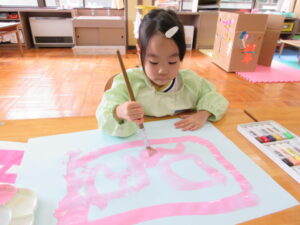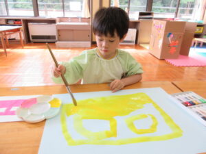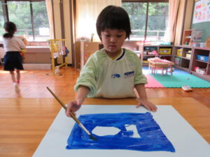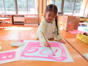 9月は絵の具でバスの絵を描きました。「公園行くんだ~」「お祭り行くんだよ」と楽しそうに描いたり、塗ったりしていました(^^♪