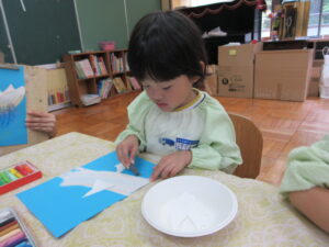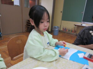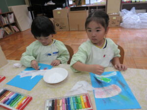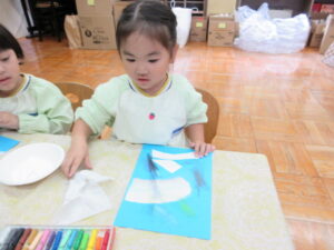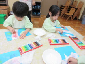 オイルクレパスを使って思い思いに色を重ねたり、ぐるぐる描いたり、点々を描いたりしました。