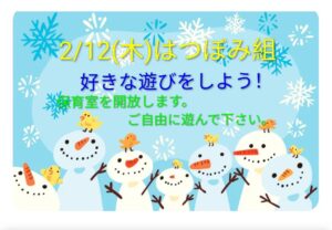 投稿日:2026.02.06カテゴリー:できごと,園からのお知らせ 2/12㈭つぼみ組☃(園開放) 2/12(木)はつぼみ組です♬ 9時半から開始です(*^^*) 今回は園児たちの発表会前練習があり、保育者は一緒に遊べませんが、つぼみ組の保育室を開放をしますのでご自由に遊んで下さい。 (9時半〜11時) ぜひぜひいらして下さいませ💕 ねんねの赤ちゃんも市外の方もどうぞ✨ ☆初めてつぼみ組へ来園いただいた方にはプチプレゼントもあります🎁 小さいお友だち!パパ、ママ、おじいちゃん、おばあちゃん!お待ちしていま〜す!
